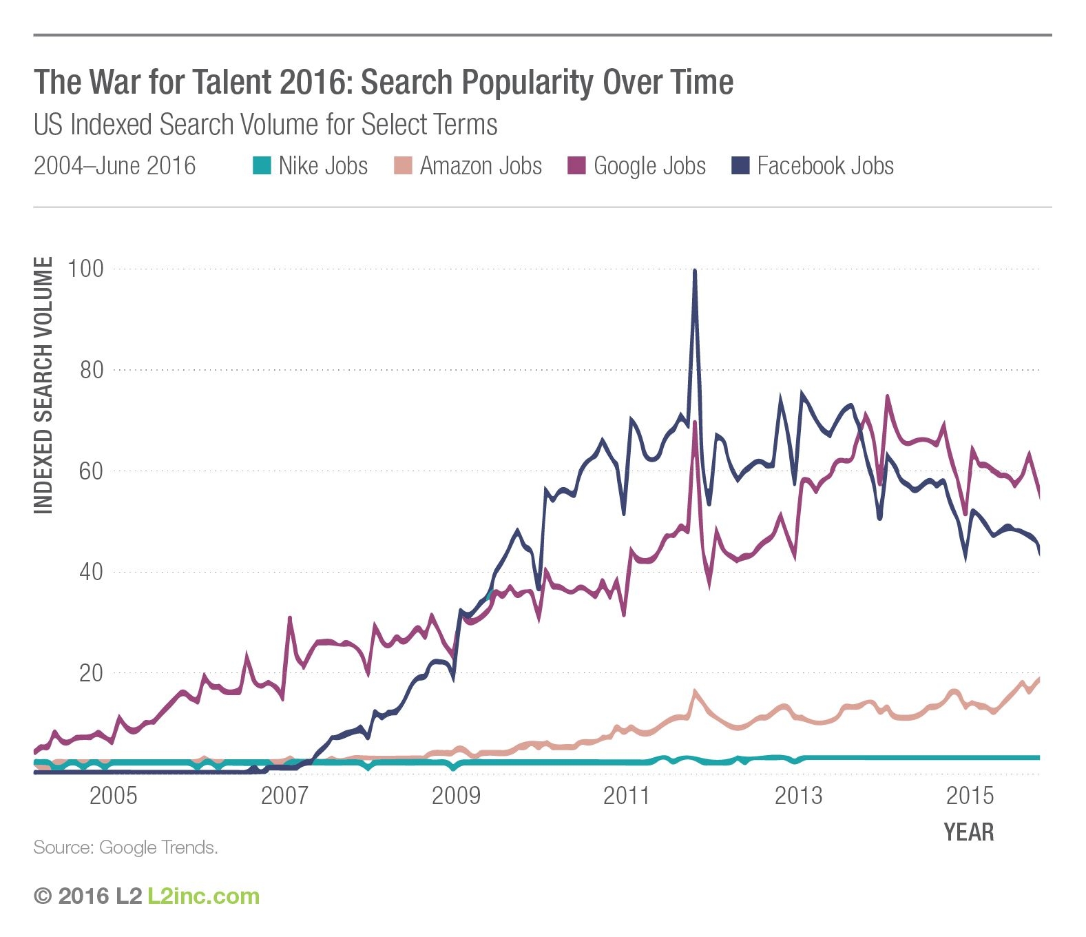 Возьмем, например, компанию Nike. Ее регулярно оценивают как одну из лучших для работы, и она действительно популярнее других лидеров потребительского топа – L'Oréal, P&G и LVMH. Но популярность Nike по-прежнему меркнет по сравнению с “цифровой природой” технологических компаний. Число запросов “работа в Amazon, Facebook или Google” в поисковиках на порядок опережают “работу в Nike".