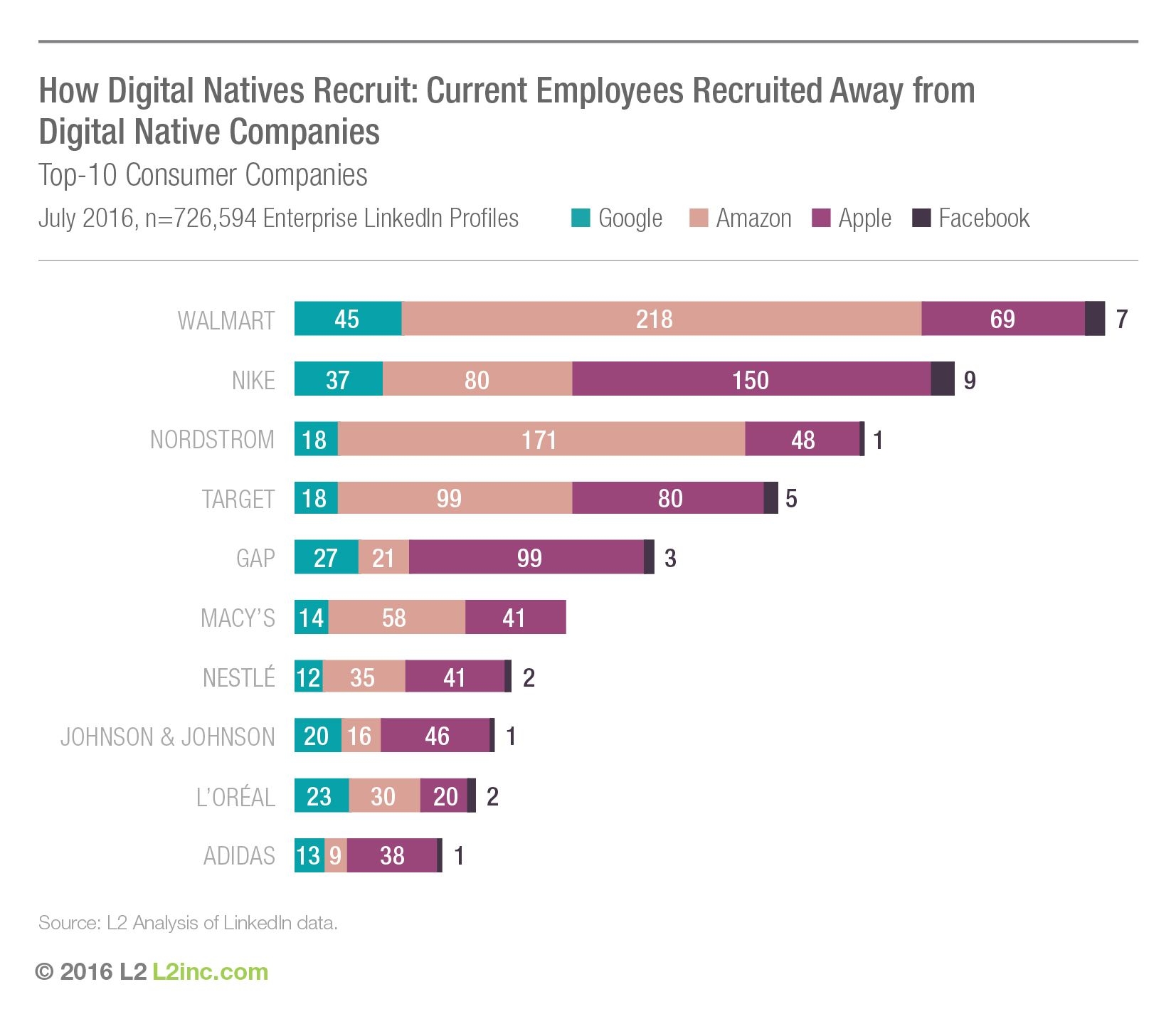 Также обнаружился массовый исход цифровых талантов из агентств в пользу прогрессивных ИТ-компаний. Facebook и Google обескровили WPP, Omnicom, Publicis и Interpublic Group. Анализ L2 на основе данных LinkedIn показал, что два технологических гиганта наняли 2,227 людей, работавших в WPP, в то время как WPP привлекла лишь около 124 бывших сотрудников Facebook и Google – итого, чистый убыток в 2100 с лишним специалистов.